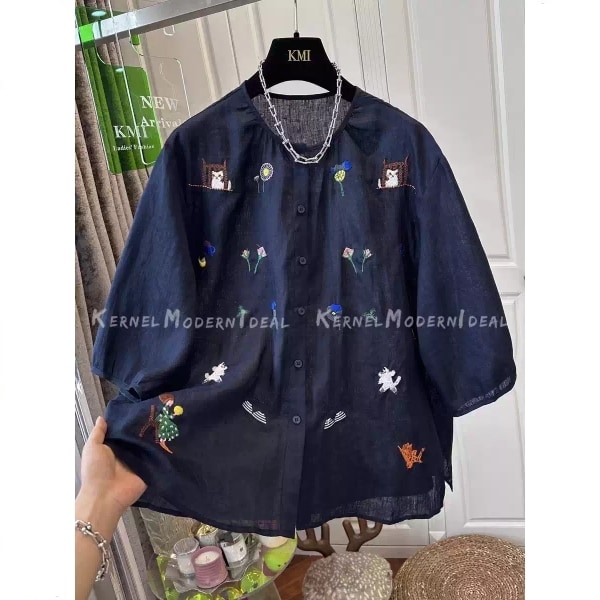 J9542棉麻可愛貓咪刺繡五分袖上衣