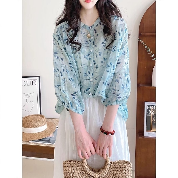 J9376薄款棉麻仙女款葉子印花圓領開襟上衣